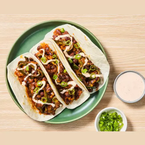 • Vegetarian tacos featuring black beans, green pepper, Tex-Mex paste, two kinds of melty cheese, and smoky red pepper crema.
