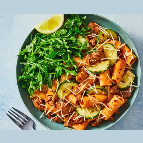 Pork Sausage & Zucchini Rigatoni Rosa with Cream Cheese, Parm & Arugula Salad
