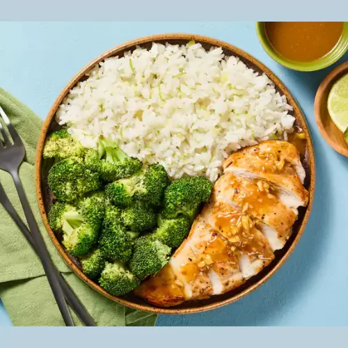 • Sides of ginger-lime jasmine rice and garlicky roasted broccoli make it a full balanced meal.