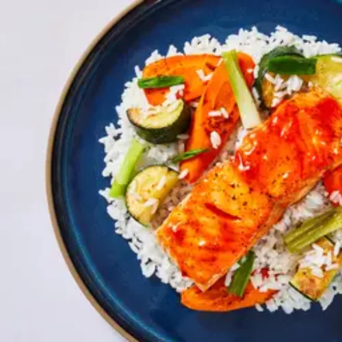 Sweet Thai Chili Salmon with Jasmine Rice, Carrots, Zucchini & Scallions