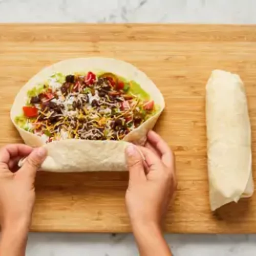 • Burritos built with lime scallion rice, spiced black beans, crispy bacon, tomato, cheese, plus guac and pickled jalapeños.