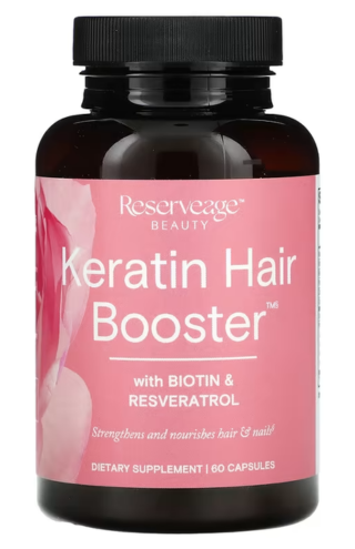 Reserveage Keratin Hair Booster strengthens hair and nails with Keratin, Biotin, and Resveratrol. It supports natural growth, reduces breakage, and nourishes from within. Gluten-free and carefully formulated, it promotes vibrant, healthy hair while protecting nails. Regular intake helps maintain hair thickness and shine, delivering consistent beauty support. This supplement balances inner wellness with visible results over time.