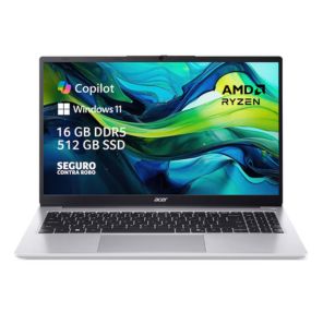 Silver laptop with AMD Ryzen 7, 16GB RAM, and 512GB SSD for high-speed performance.