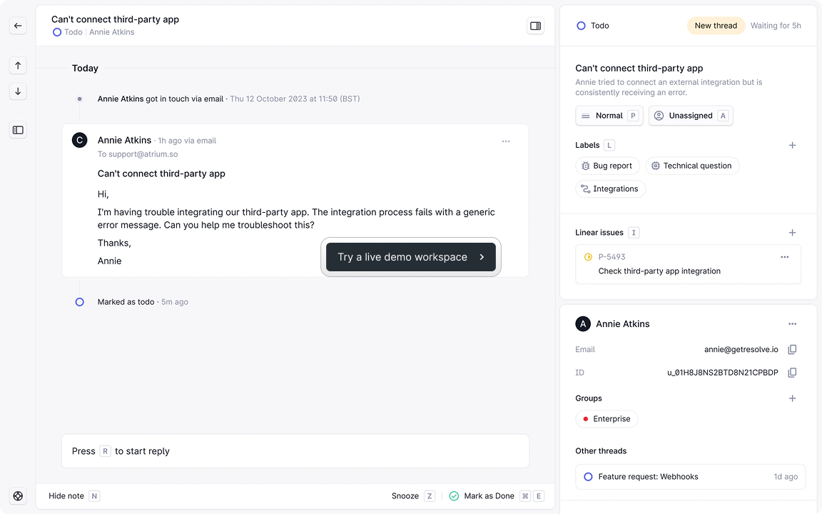 Meet the support platform that works the way you work with your customers. Incredibly fast, integrated with Linear and Slack, and a powerful API for everything else.